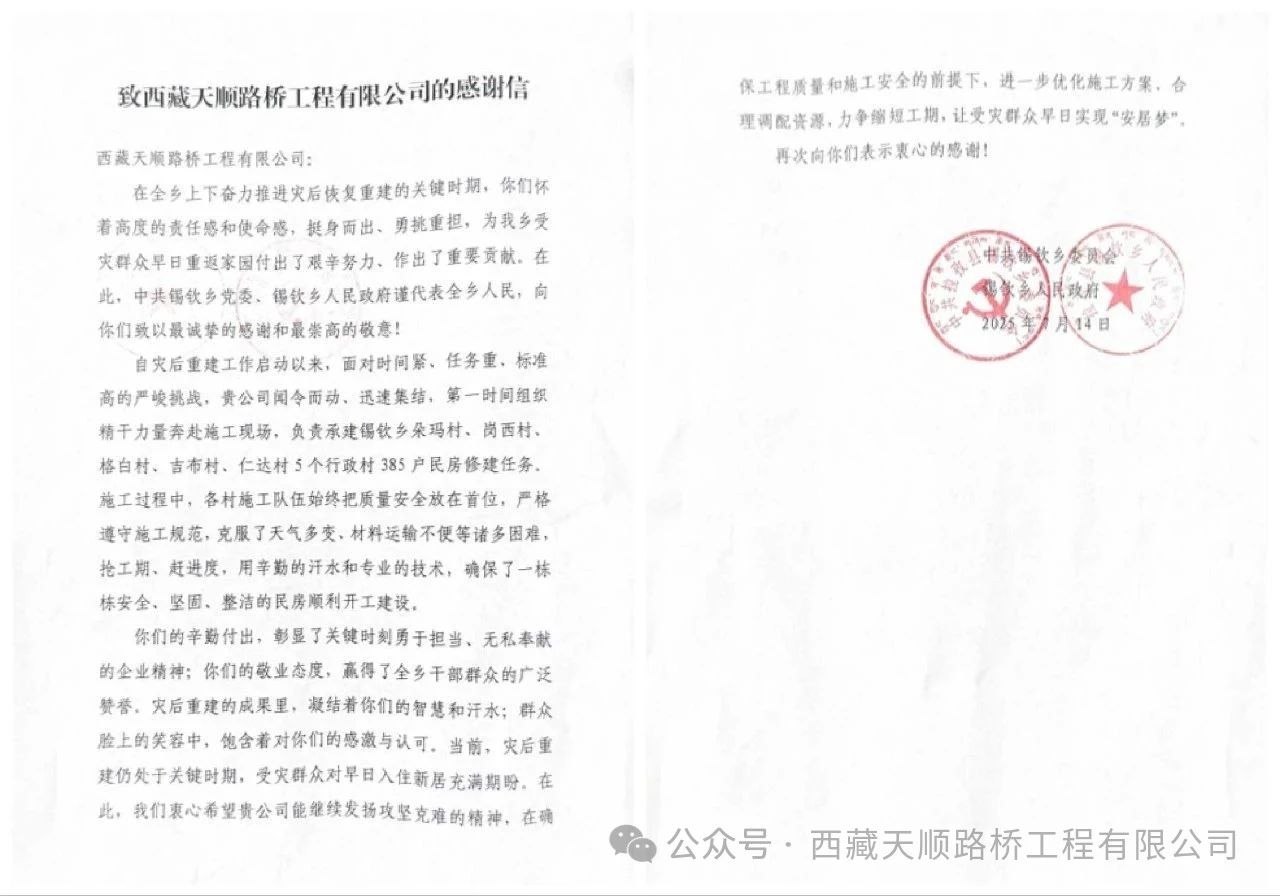 近日,中共锡钦乡党委、锡钦乡人民政府向我公司发来感谢信,对我公司在灾后重建工作中作出的突出贡献表示高度认可和诚挚感谢。信中充分肯定了西藏天顺路桥工程有限公司在锡钦乡灾后重建中的责任担当、专业能力和奉献精神,展现了国企的社会责任与使命。
